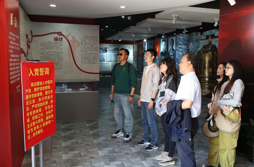 在纪念馆的党旗前,全体党员庄严肃立,高举右拳,重温入党誓词。“我志愿加入中国共产党…… 随时准备为党和人民牺牲一切,永不叛党。” 铿锵有力的誓言,在天崮山的山谷间久久回荡,表达了党员们对党的无限忠诚和为共产主义事业奋斗终身的坚定决心,每一位党员都再次接受了心灵的洗礼,更加坚定了自己的初心和使命。