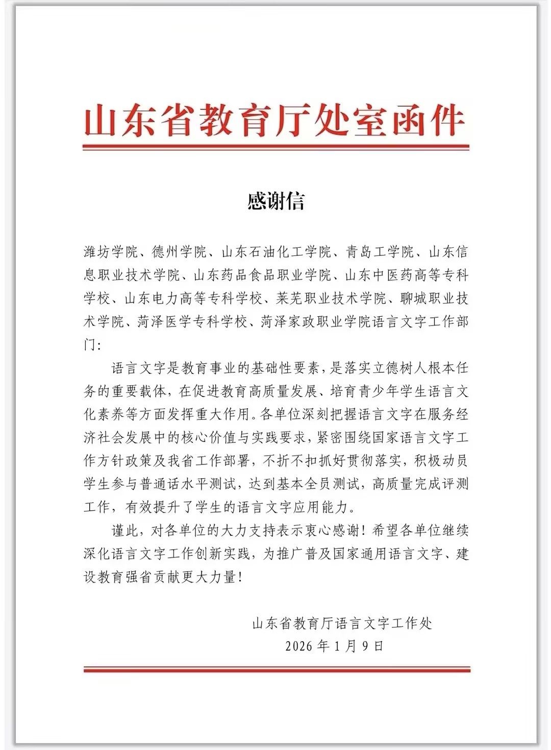 近日,我校收到山东省教育厅发来的感谢信,信中对我校长期以来积极配合、全力支持全省语言文字工作,尤其是在普通话水平测试、诗词大会、普通话宣传周等重点活动中展现的责任担当与扎实成效,致以诚挚谢意与高度肯定。